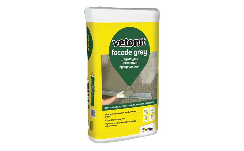 Weber Vetonit — высококачественная цементная штукатурка. Используется для выравнивания стен и потолков перед финишным шпаклеванием и плиточной облицовкой. Может применяться в сухих и влажных помещениях. При высыхании образует крайне прочный слой, не трескающийся и устойчивый к механическим воздействиям. Допускается ручное и автоматизированное нанесение.